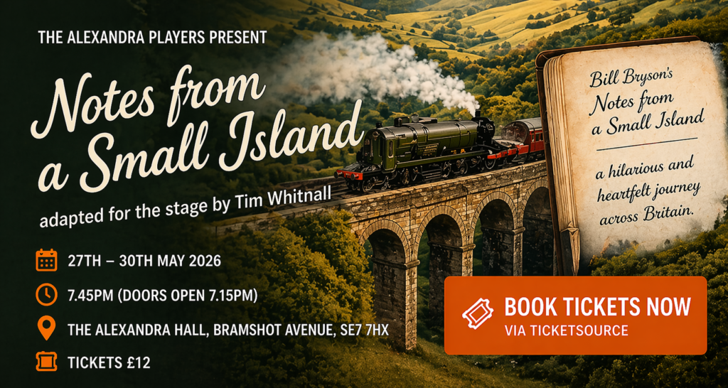 #Acting #Amdram #AmateurDramatics #AmateurTheatre #BillBryson #Blackheath #BritishComedy #BritishTheatre #Charlton #Drama #Greenwich #LiveTheatre #LocalTheatre #London #NotesFromASmallIsland #NextProduction #Plumstead #SE10 #SE18 #SE3 #SE7 #SELondon #SouthEast #StageAdaptation #SupportLocalTheatre #TheAlexandraPlayers #Theatre #TheatreLife #TimWhitnall #Woolwich